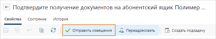 Извещения о получении документов создаются, подписываются сертификатом квалифицированной электронной подписи (ЭП) и отправляются в сервис обмена автоматически при выполнении задания на обработку, при отправке или возврате документов контрагентам. При этом если на следующий день после поступления из сервиса обмена остались документы, по которым еще не отправлены извещения, то ответственному за абонентский ящик нашей организации приходит задание на отправку извещений о получении документов.