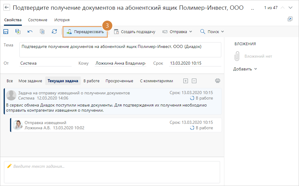 5.Нажмите на кнопку Переадресовать. В результате указанный сотрудник получит задание на отправку извещений о получении документов.