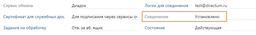 На основании введенных данных устанавливается соединение с сервисом обмена. Проверяется доступность сервиса, корректность логина и пароля служебного пользователя. Также сверяются ИНН и КПП нашей организации с реквизитами, которые указаны в сервисе обмена. Если все данные указаны верно, соединение с сервисом обмена будет установлено:
