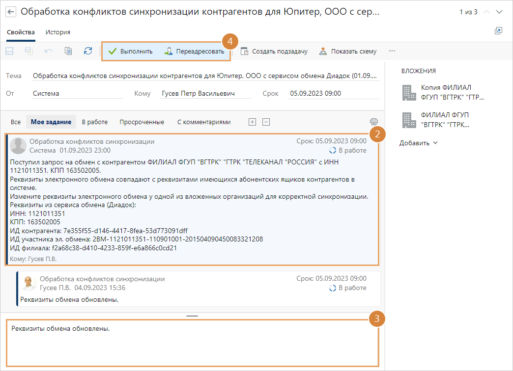 3.Если в системе есть несколько записей контрагентов с нужным ИНН или недостаточно данных, чтобы соотнести контрагентов, то ответственному за абонентский ящик нашей организации придет задание на обработку конфликта синхронизации контрагентов. Для дальнейшего взаимодействия с контрагентом через сервис обмена необходимо устранить возникший конфликт.