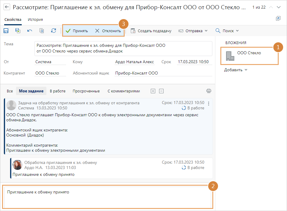 Если контрагент прислал нашей организации приглашение к обмену электронными документами через сервис обмена, то в системе ответственному за абонентский ящик нашей организации придет задание на рассмотрение приглашения: