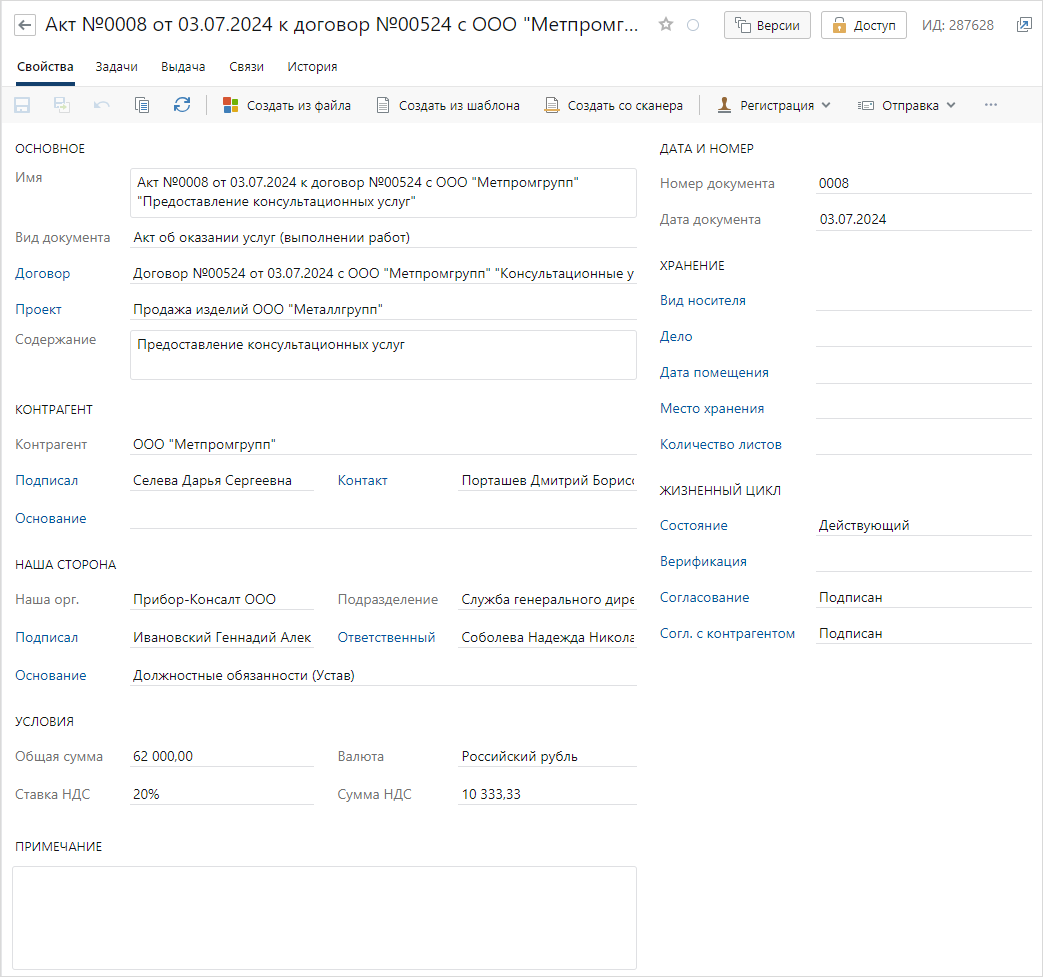 Чтобы занести в систему скан-копию бумажного экземпляра вручную: 1.Создайте карточку акта выполненных работ и заполните поля. Совет. Для корректного заполнения полей воспользуйтесь бумажным экземпляром документа. 2.Отсканируйте бумажный экземпляр документа. Для этого в карточке акта нажмите на кнопку Создать со сканера. 3.Присвойте документу номер и дату, которые указаны в бумажном экземпляре. Для этого в карточке акта на панели действий в выпадающем списке Регистрация выберите пункт Присвоить номер. 4.В группе полей «Жизненный цикл» укажите, что документ действующий и подписан обеими сторонами: