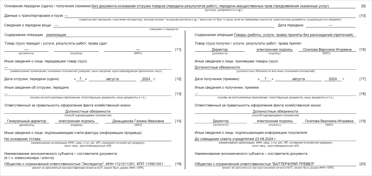 Если в универсальном передаточном документе нужно указать дополнительные сведения о приемке товаров (работ), перед подписанием документа заполните информацию покупателя (заказчика). Для этого: