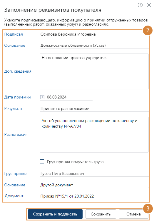 Сохранить и подписать, чтобы заполнить сведения о получении товаров (приемке работ) и подписать документ своим сертификатом ЭП. Действие доступно, если у вас есть право подписи документа.