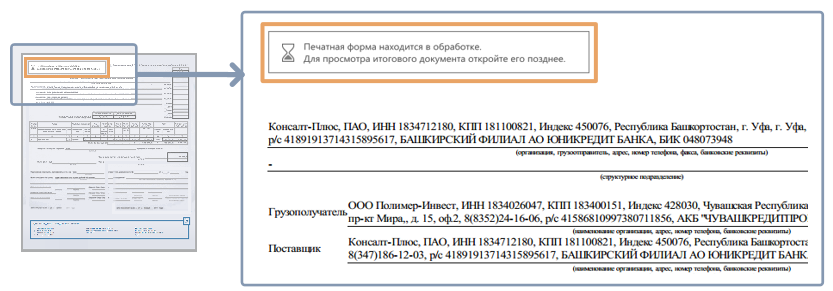 Примечание. Информация в версии документа заполнится через некоторое время. До этого при просмотре товарной накладной в левом верхнем углу документа отображается временный штамп: