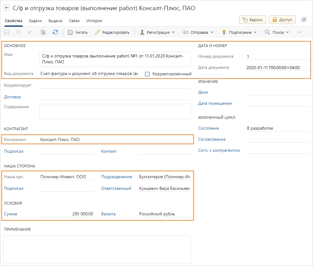 После импорта карточка документа откроется автоматически. Часть полей в ней заполнится данными из документа: