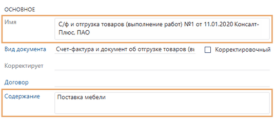 Если необходимо заполнить недостающие данные в полях, которые доступны только для просмотра, на панели действий в выпадающем списке Регистрация выберите пункт Изменить реквизиты. Часть полей станет доступна для изменения. Например: •в поле Содержание укажите краткую характеристику документа, которая отражает суть сделки. В дальнейшем это позволит однозначно идентифицировать документ в системе. Введенное значение используется в имени документа: