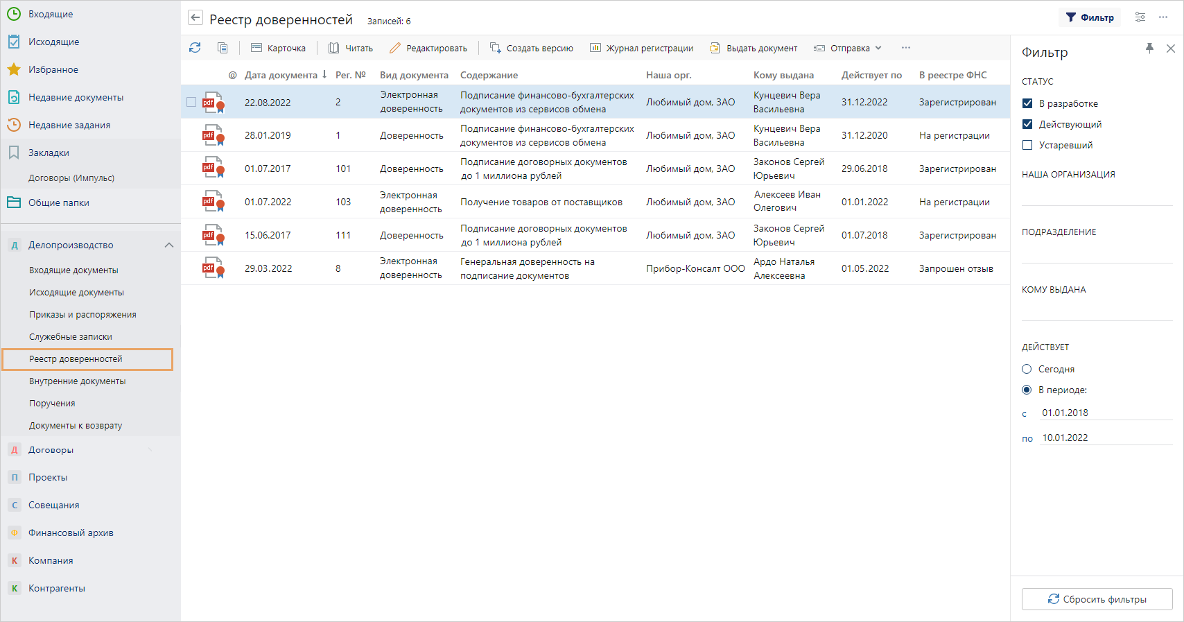 Список можно открыть c панели навигации или по ссылке Реестр доверенностей на обложках модулей: «Делопроизводство», «Договоры», «Финансовый архив».
