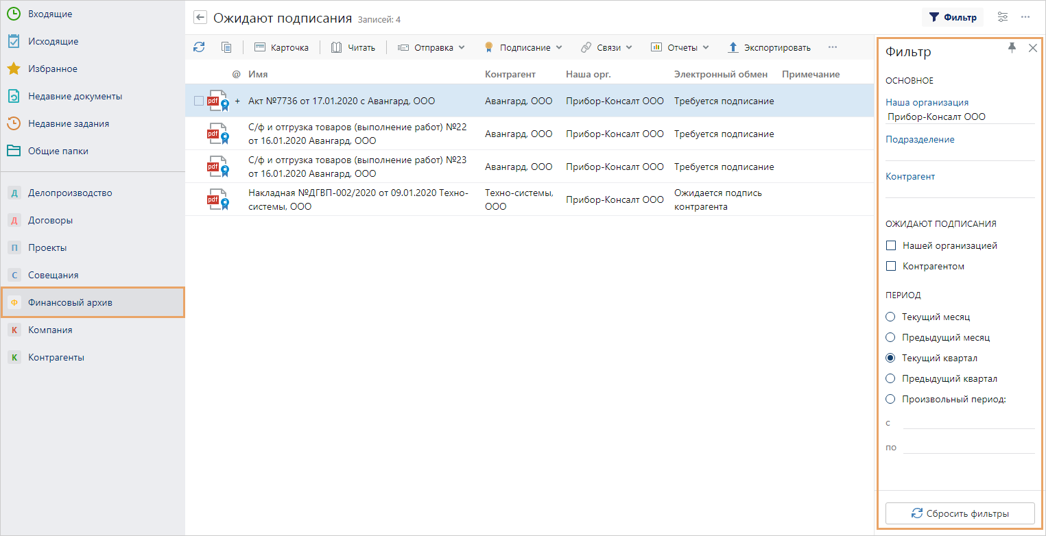 Для быстрого поиска финансово-хозяйственных документов, которые ожидают подписания в сервисе обмена, по разным параметрам используйте панель фильтрации.