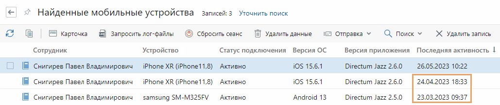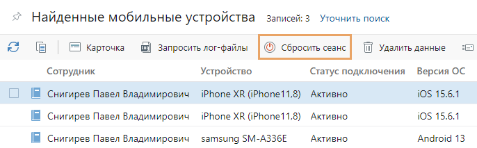 Чтобы сбросить сеанс, выделите нужную запись в списке мобильных устройств и на панели действий нажмите на кнопку Сбросить сеанс: