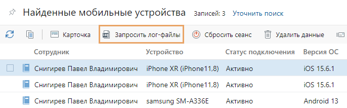 ПРИМЕЧАНИЕ. Запросить лог-файлы также можно по соответствующей кнопке на панели действий в карточке мобильного устройства.