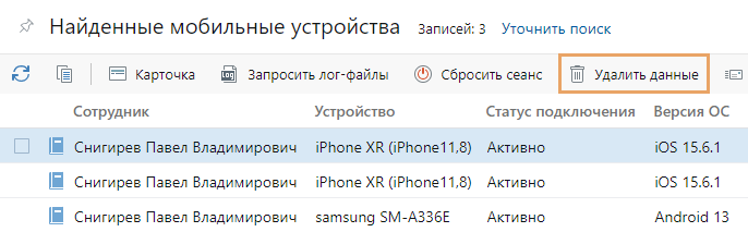 Чтобы отправить запрос на удаление данных, выделите нужную запись в списке мобильных устройств и на панели действий нажмите на кнопку Удалить данные: