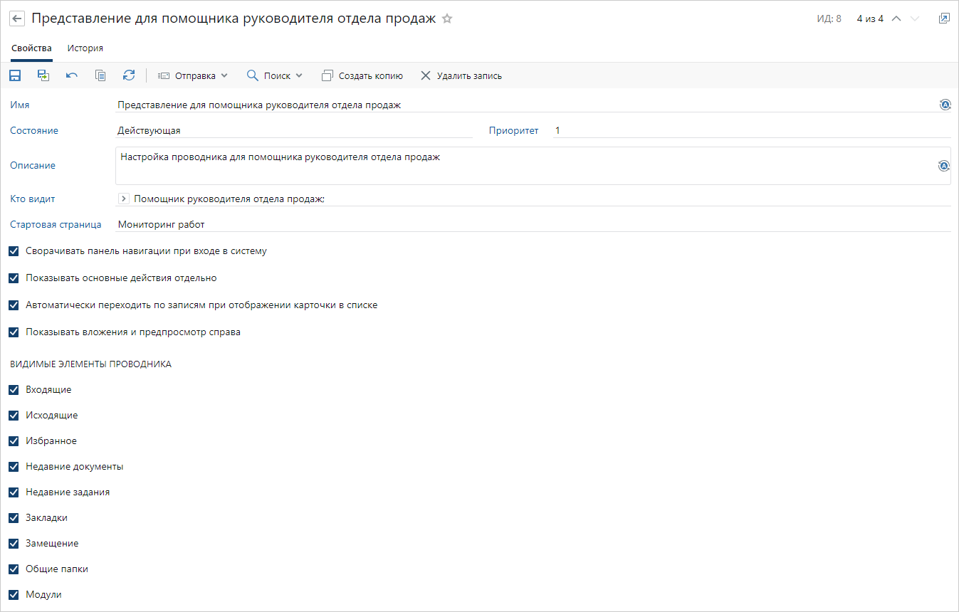 Настройки задаются в справочнике Представления проводника. В представлении можно указать видимость элементов проводника, стартовую страницу, расположение предпросмотра и вложений, а также состояние панели навигации: свернута или показана. Кроме того, можно показать или скрыть основные действия при отображении карточки в списке.