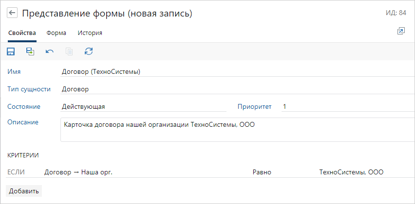 ПРИМЕЧАНИЕ. Если после заполнения карточки должно измениться представление формы, то оно отобразится после ее сохранения и повторного открытия. Например, для договора отдела продаж настроено свое представление формы. Сотрудник создает договор, в котором отображается форма по умолчанию, и указывает в поле Подразделение значение Отдел продаж. Актуальное представление карточки применится после ее сохранения и переоткрытия.