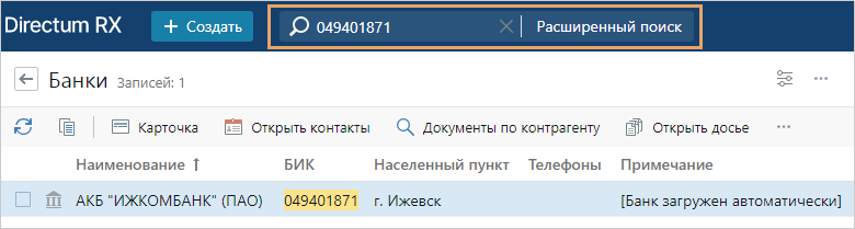 СОВЕТ. При создании новой записи справочника убедитесь, что нужного банка в справочнике нет. Для этого в модуле «Контрагенты» в списке записей справочника Банки в строке поиска введите, например, часть названия или БИК банка и нажмите клавишу ENTER: