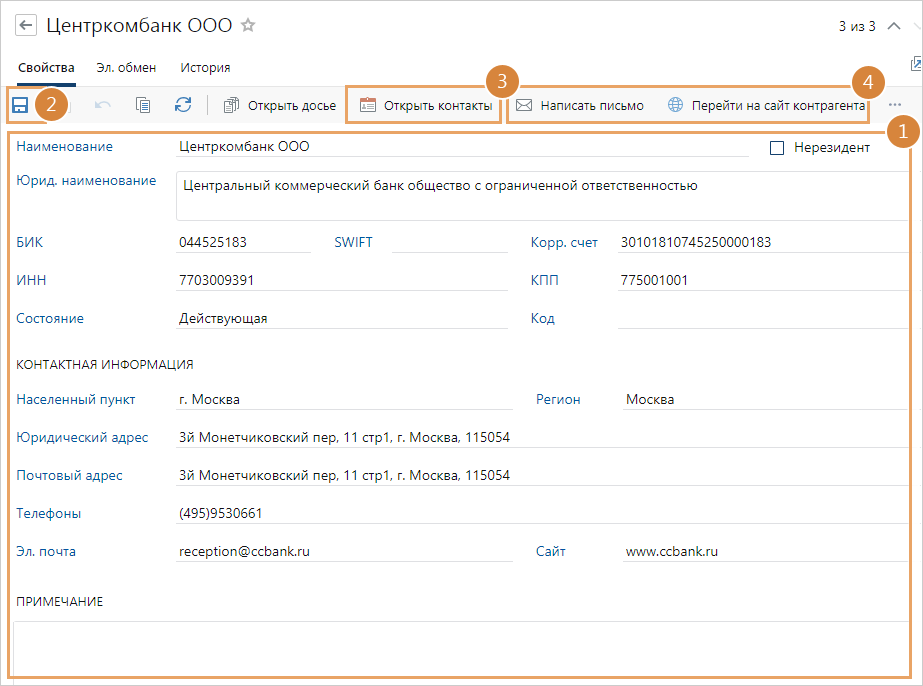 Если указан сайт банка, то можно перейти на него из карточки. Для этого на панели действий нажмите на кнопку Перейти на сайт контрагента.