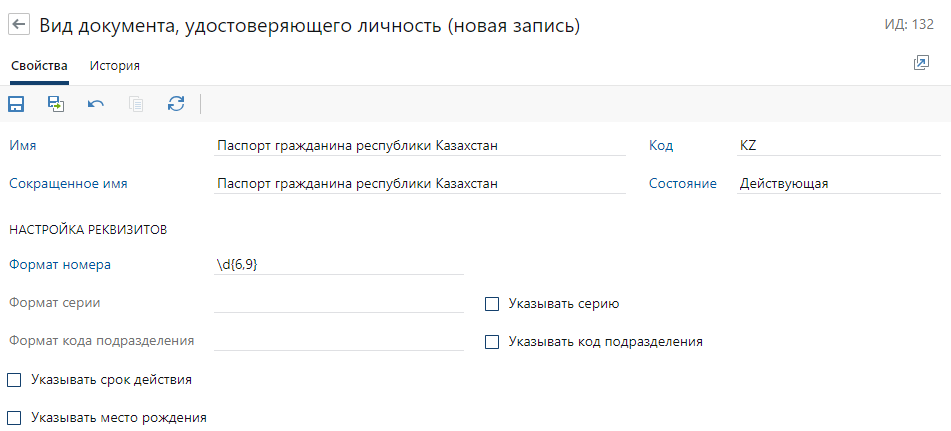 *Формат номера документа, указывается в виде регулярного выражения. Подробнее см. пример для номера паспорта Казахстана.
