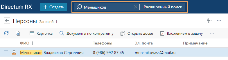 Совет. При создании новой записи, убедитесь, что нужной персоны в справочнике нет. Для этого в модуле «Контрагенты» в списке записей справочника Персоны в строке поиска введите ФИО персоны и нажмите клавишу ENTER:
