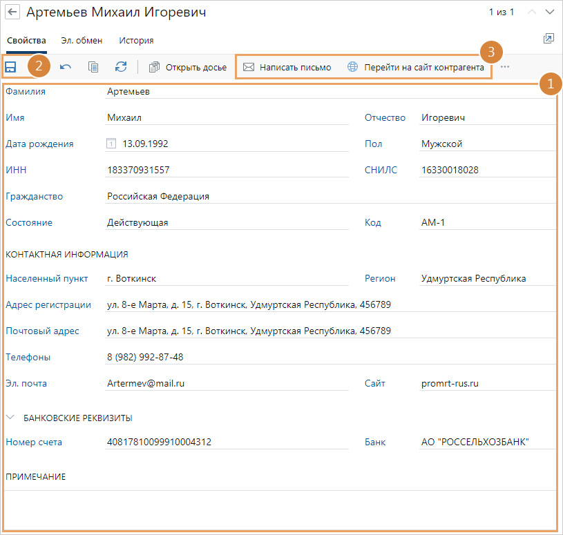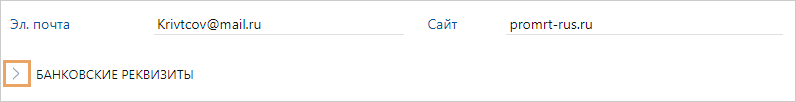 Например, для контрагента указан код КМИ. Тогда документ, который относится к данному контрагенту, при регистрации может иметь номер ДП-0001/18/КМИ. Населенный пункт и Регион проживания персоны. Адрес регистрации и Почтовый адрес. Адреса регистрации и проживания персоны. Телефоны, Эл. почта и Сайт. Контактные данные персоны. Номер счета и Банк. Номер расчетного счета, который используется для учета денежных операций персоны, и банк, в котором открыт счет. Номер счета может содержать от 8 до 34 символов. Номер российского счета состоит из 20 цифр. Для международных счетов допускается использование заглавных латинских букв. ПРИМЕЧАНИЕ. По умолчанию поля Номер счета и Банк в карточке организации скрыты. Чтобы отобразить их, нажмите на кнопку