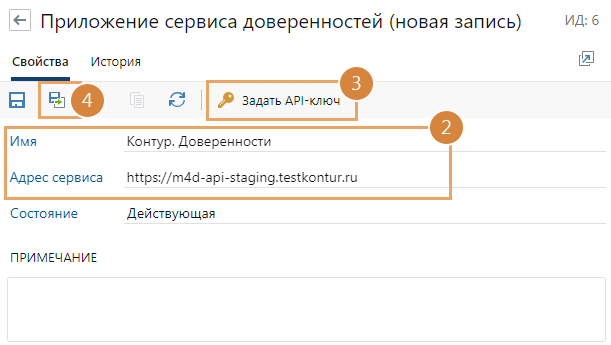 Перед настройкой подключения нашей организации к сервису доверенностей необходимо создать запись в справочнике Приложения сервиса доверенностей. В ней задается точка доступа к сервису Контур.Доверенность через API.