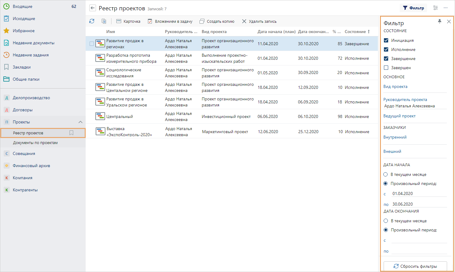 Параметры фильтрации реестра проектов |