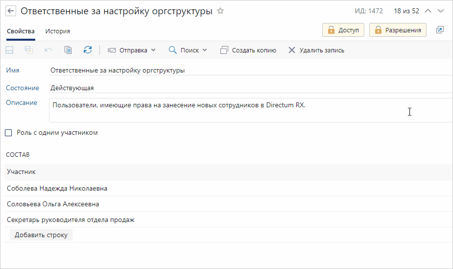 Права доступа настраиваются в зависимости от действий, которые сотрудники должны выполнять с объектами определенного типа. Предположим, сотрудникам из роли «Ответственные за настройку оргструктуры» нужно назначить права на создание записей справочников Сотрудник, Персона, Подразделение, Учетная запись и Должность. Чтобы настроить права доступа: