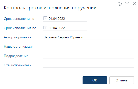 Отчет предназначен для руководителей и их помощников, чтобы контролировать сроки исполнения поручений за определенный период.