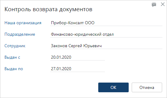 Отчет предназначен для формирования списка документов, бумажные оригиналы или копии которых выданы сотрудникам и отправлены контрагентам, но еще не возвращены или не подлежат возврату. Отчет позволяет определить документы, возврат которых задерживается, сотрудников, ответственных за возврат, и число дней задержки. Если есть документы, возврат которых задерживается, то напомните ответственному сотруднику о необходимости вернуть документ.