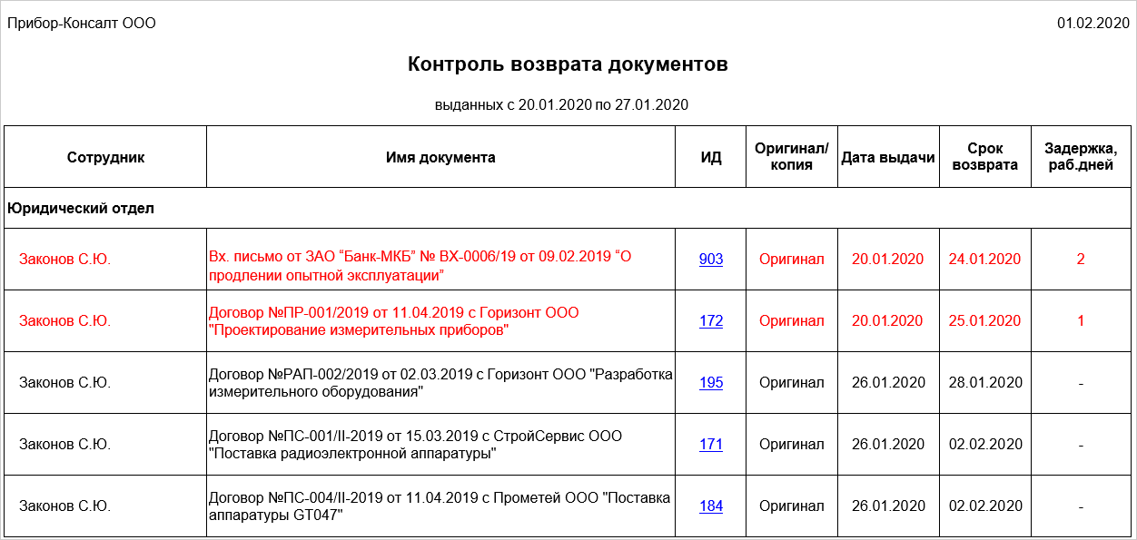 Отчет формируется на основе записей журналов передачи оригиналов и копий документов, которые находятся в карточках документов на закладке «Выдача». В отчете отображаются фамилия и инициалы сотрудника, которому выдан документ, имя и ИД документа, отметка о выдаче оригинала или копии, дата выдачи, срок возврата и количество дней задержки возврата документа. Записи в таблице сгруппированы по подразделениям. Чтобы открыть карточку документа, перейдите по ссылке в колонке ИД. Красным цветом выделяются документы, возврат которых задерживается. |