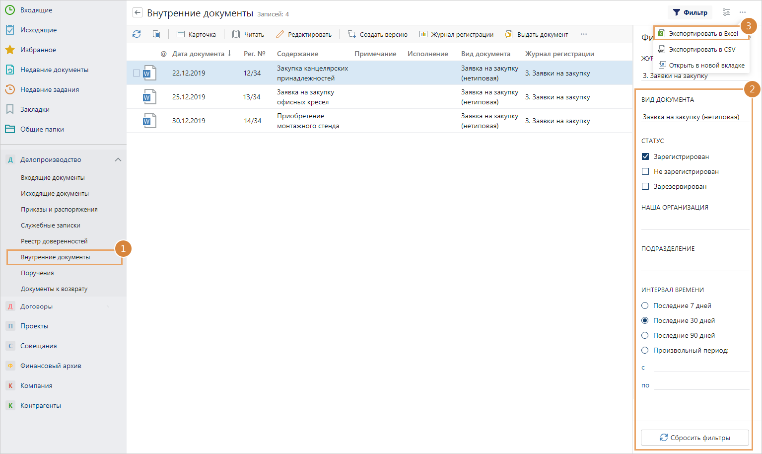 •экспорта в Excel списка документов выбранного журнала регистрации.