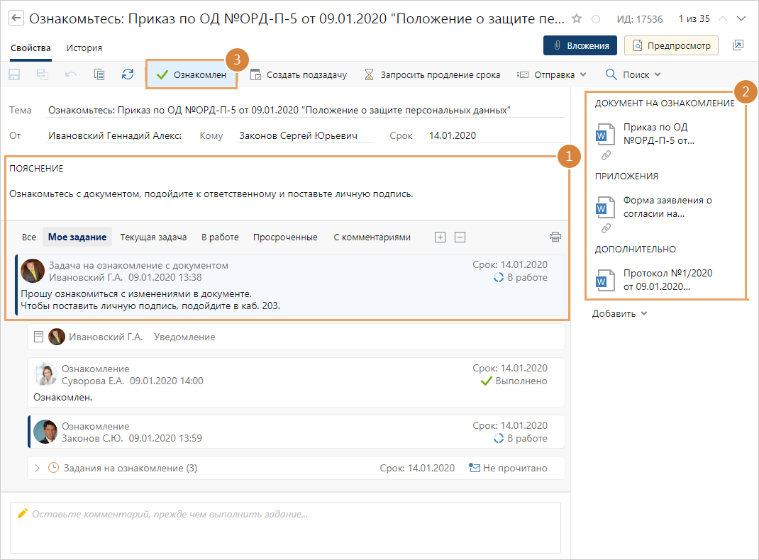 Важно. По умолчанию выполнить задание на ознакомление может только сотрудник, которому оно адресовано. Если он отсутствует, например, находится в отпуске или на больничном, то замещающий, руководитель и администратор не могут выполнить задание за него. Замещающий или непосредственный руководитель может выполнить задание, если у этого сотрудника запись в справочнике «Сотрудники»: