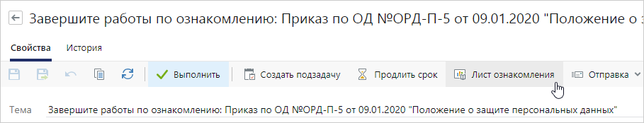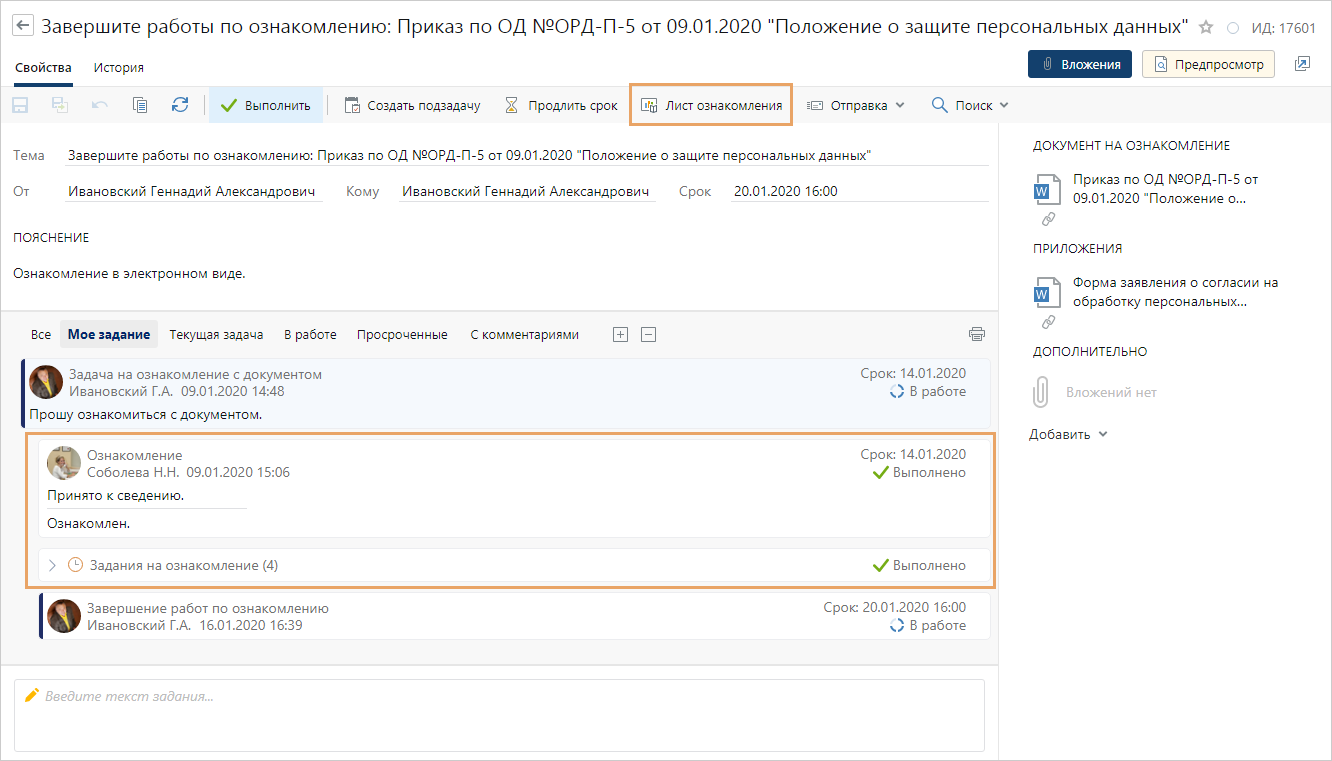 1.Откройте карточку задания. Проверьте, все ли сотрудники ознакомились с документом и лично выполнили задание. Если задание выполнено по замещению, то это отобразится в переписке. Также используйте отчет «Лист ознакомления». Для этого нажмите на кнопку Лист ознакомления. Подробнее см. пример формирования отчета для итогового контроля.
