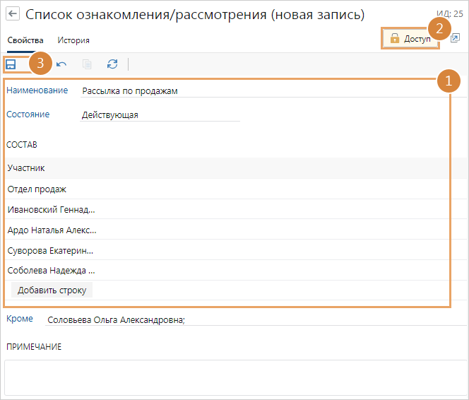 2.На список автоматически выдаются полные права сотруднику, который его создал. Выдайте права доступа другим сотрудникам, чтобы они использовали список для быстрого заполнения участников задачи на ознакомление или рассмотрение.