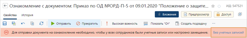 8.Если среди участников есть сотрудники без учетной записи и для них не настроено замещение, то появится сообщение об этом. Их необходимо исключить из участников ознакомления.