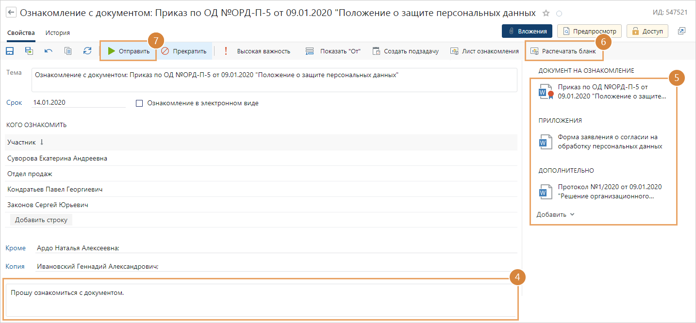 Примечание. Возможность отправлять на ознакомление настраивается для видов документов в соответствии с принятым в организации порядком работы. Если для нужного вида документа отправка на ознакомление недоступна, обратитесь к администратору системы.
