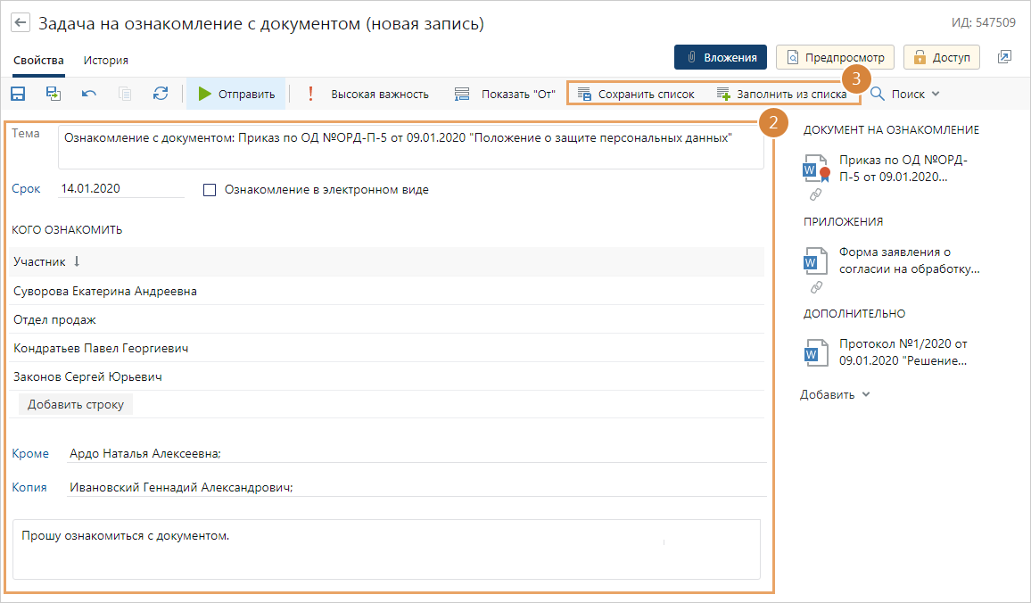 *Тема. Краткая суть задачи. Заполняется автоматически в формате «Ознакомление с документом: <Имя документа>». *Срок. Дата, к которой сотрудникам необходимо ознакомиться с документом. Ознакомление в электронном виде. Для подтверждения ознакомления сотрудникам нужно прочитать электронный документ и выполнить задание. На ознакомление в электронном виде можно отправить только документ, у которого есть хотя бы одна версия. По умолчанию флажок установлен. Снимите флажок, если для подтверждения ознакомления с документом сотрудникам нужно поставить личную подпись на бумажном документе. В этом случае в задании на ознакомление появится пояснение, что сотрудникам нужно подойти к ответственному и поставить личную подпись. По завершении получить. Тип задания, которое получит инициатор после завершения ознакомления. Возможные значения: Задание, Уведомление. *Участник. Сотрудники, которым нужно ознакомиться с документом. Кроме сотрудников можно также указать роли, группы, подразделения и организации. Если в поле указать головное подразделение, то задание на ознакомление отправляется сотрудникам головного и дочерних подразделений. Совет. Если необходимо ознакомить с документом несколько сотен сотрудников, то в качестве участников рекомендуется указывать роли, группы, подразделения или организации. При этом количество участников ознакомления не должно превышать 2000. Если участников больше, то при старте задачи появится сообщение об этом. Для быстрого заполнения участников воспользуйтесь списками ознакомления. Подробнее см. пункт 3. Кроме. Сотрудники, которых нужно исключить из участников ознакомления. Например, если документ нужно отправить на ознакомление всем сотрудникам отдела продаж за исключением руководителя, то в поле *Участник укажите отдел продаж, а в поле Кроме – руководителя отдела продаж. Кроме сотрудников можно также указать роли, группы, подразделения и организации. Копия. Сотрудники, которые заинтересованы ходом ознакомления с документом. После старта задачи они получают уведомления. |