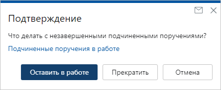 Выполните одно из действий: Оставить в работе. Поручение выполняется, подчиненные поручения не прекращаются. Выберите этот вариант, если вы хотите выполнить только свое задание. Прекратить. Поручение выполняется, незавершенные подчиненные поручения прекращаются. Выберите этот вариант, если подчиненные поручения стали неактуальными. Отмена. Поручение не выполняется, подчиненные остаются в работе. Выберите этот вариант, если хотите вернуться в карточку поручения. Если перед выполнением задания на исполнение поручения нужно посмотреть незавершенные подчиненные поручения, нажмите на ссылку Подчиненные поручения в работе. Откроется список поручений: Ознакомьтесь с поручениями, проверьте на актуальность и только после этого примите решение. |