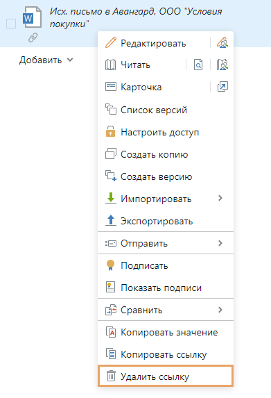Удалять ссылки на документы можно только из группы «Результаты исполнения». Для этого в контекстном меню нужно выбрать пункт Удалить ссылку.