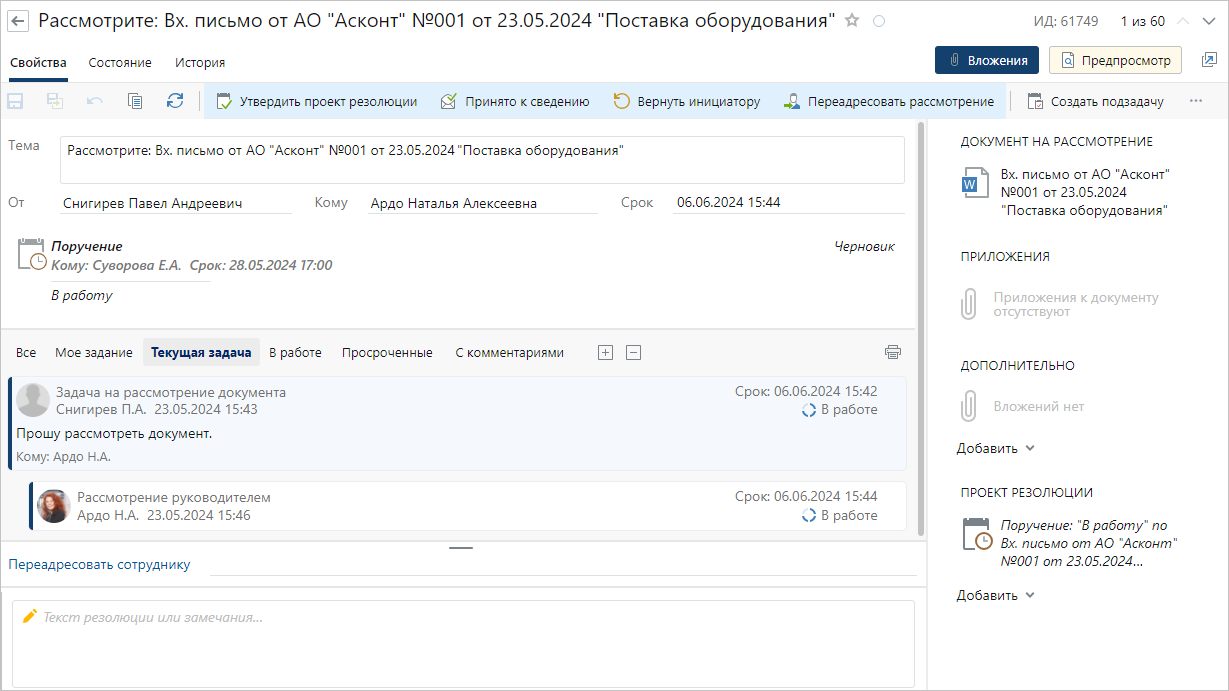 Проект резолюции создается автоматически, если для руководителя, который выдает поручения в ходе рассмотрения документа, настроен виртуальный помощник с установленным флажком Готовит резолюцию для руководителя. В этом случае руководителю или его помощнику приходит задание с вложенным проектом резолюции: