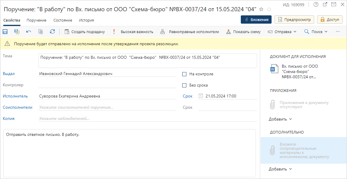 3.Если поручение создается из задания на рассмотрение документа или на создание поручения, то во вложении будет ссылка на документ для исполнения и связанные с ним действующие приложения и приложения в разработке. Если для исполнения поручения понадобятся другие документы, то добавьте их вручную в группу вложений «Дополнительно». Если у участников задачи отсутствуют права на вложения из группы «Дополнительно», то при старте задачи появится сообщение с предложением назначить права доступа.