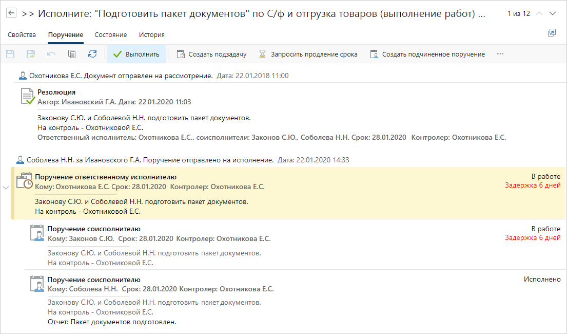 •контролировать сроки выполнения работ по поручению. Например, контролер может узнать, кто из сотрудников задерживает выполнение поручения и на сколько дней;