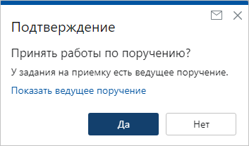 5.Если ведущее поручение уже выполнено, при приемке работ открывается окно подтверждения. Ознакомьтесь с ведущим поручением по ссылке Показать ведущее поручение и нажмите Да, если хотите принять работы по поручению: