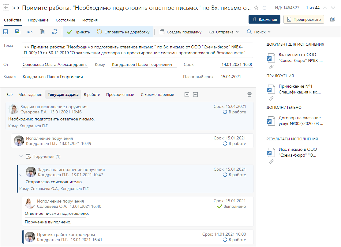 Например, Соловьева О. отправила поручение Ардо Н., Ардо передала его в работу соисполнителям и отправила им дополнительные поручения. Когда соисполнители выполнили все работы по ведущему поручению, Ардо выполнила свое задание. Дополнительные поручения остались в работе. Через длительное время при приемке работ по подчиненным поручениям контролеру потребуется посмотреть ведущее поручение, чтобы вспомнить его суть.