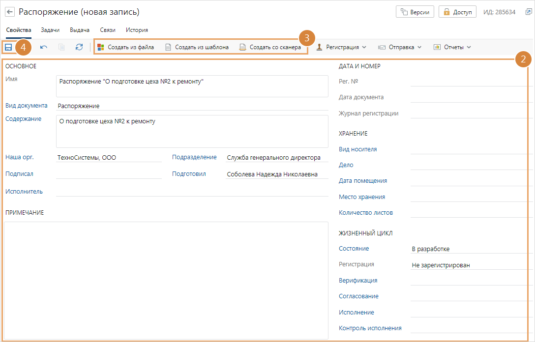 ПРИМЕЧАНИЕ. Содержимое документа можно не добавлять, например, если распоряжение содержит конфиденциальную информацию. В этом случае заполните поля в карточке и сохраните ее. Появится сообщение о том, что создан документ без содержимого.