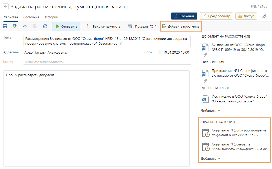 1.Создайте задачу для отправки документа на рассмотрение, проверьте значения полей в карточке и добавьте ссылки на дополнительные документы, как в порядке действий выше.