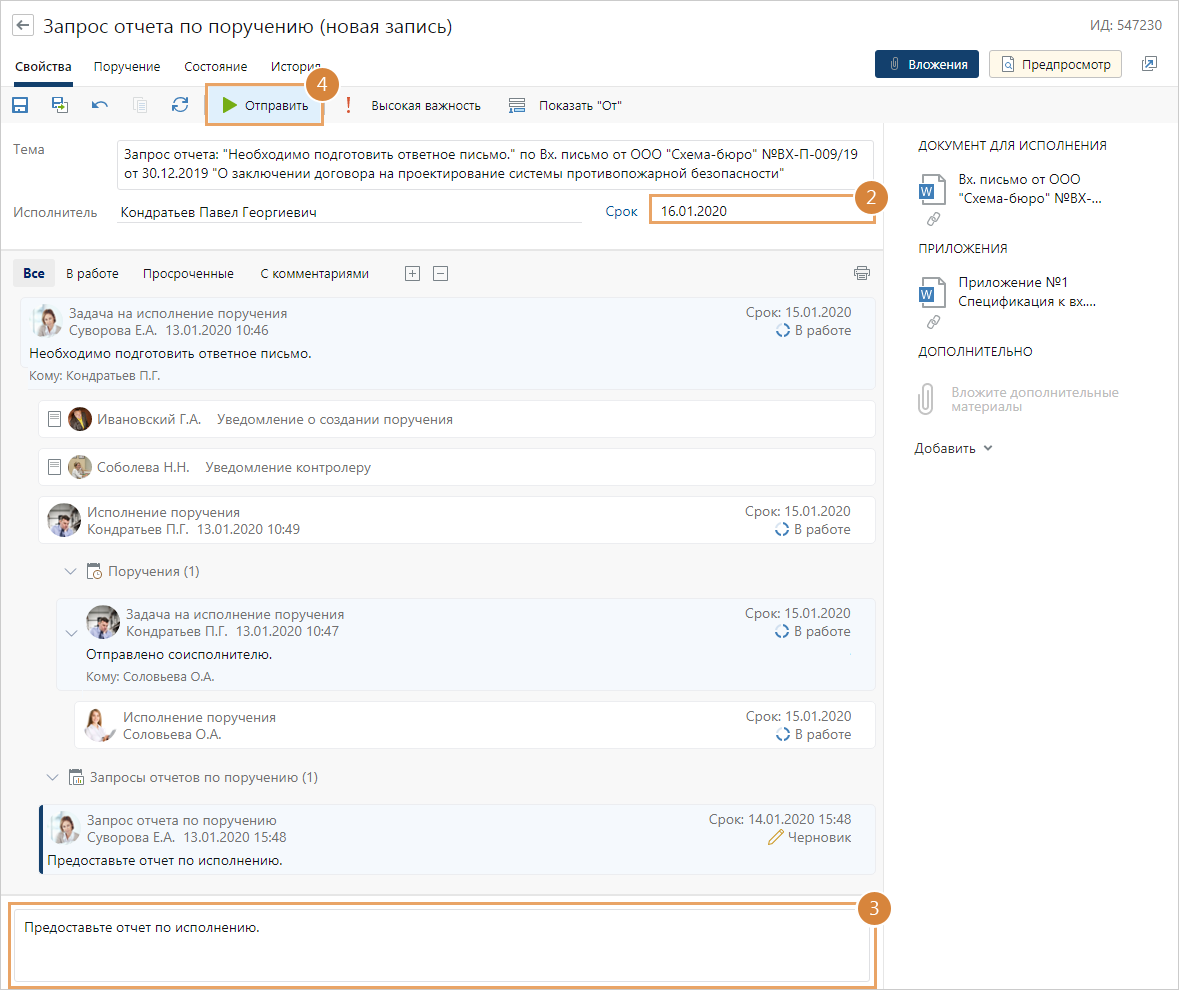 После того, как исполнитель ответит на запрос, вернется задание на проверку отчета. Задание можно вернуть исполнителю для уточнения сведений или принять.