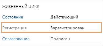 В результате документ с присвоенным номером будет сохранен и зарегистрирован в указанном журнале регистрации. Основные поля карточки документа станут доступны только для просмотра. В группе полей «Жизненный цикл» в поле Регистрация установится значение Зарегистрирован: