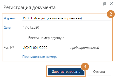 ВАЖНО. Если для документа ранее был зарезервирован номер, то при нажатии на пункт Зарегистрировать откроется окно подтверждения регистрации. В окне будет информация о регистрационном номере, дате и журнале регистрации. Нажмите в этом окне на кнопку Зарегистрировать. Документ будет зарегистрирован и сохранен. Дальнейшие действия по регистрации не нужны.