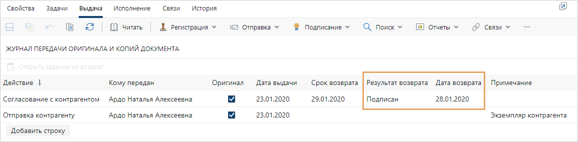 В журнале передачи оригиналов и копий документа в соответствующей строке поле Дата возврата заполнится текущей датой, а поле Результат возврата значением Подписан. |