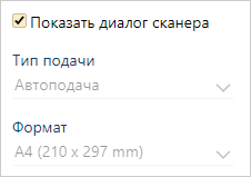 Если установлен переключатель TWAIN, то станет доступен флажок Показать диалог сканера. Установите флажок, если нужно задать дополнительные параметры, предусмотренные сканером. После установки поля Тип подачи, Формат, Разрешение и Цвет доступны только для просмотра, так как для сканирования используются настройки из диалога сканера: